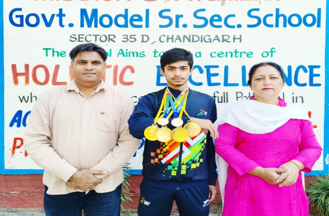 चंडीगढ़ (चन्द्र शेखर धरणी) : आज गवर्नमेंट मॉडल सीनियर सैकंडरी स्कूल सेक्टर-35डी चंडीगढ़ की प्रार्थना सभा में उस समय माहौल खुशनुमा हो गया जब बच्चों की तालियों की गड़गड़ाहट के बीच स्कूल की मैडलिस्ट टीमों स्केटिंग, क्रिकेट, गतका और वेट लिफ्टिंग के खिलाड़ियों का स्वागत किया गया। खिलाड़ियों द्वारा शानदार प्रदर्शन करने पर स्कूल की प्रिंसिपल सीमा ग्रोवर द्वारा मेडल पहनाकर सम्मानित किया गया। मेडलिस्ट खिलाड़ियों में नोदित गुप्ता ने इंटर स्कूल स्टेट स्केटिंग टूर्नामेंट में 02 गोल्ड मेडल जीते। नोदित ने रिंक-3 (500मी.) और रिंक-4 (1000मी.) में गोल्ड मेडल जीते।