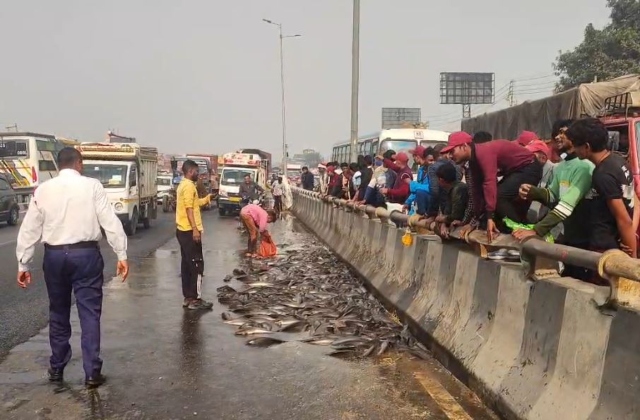 सोनीपत (सन्नी मलिक) : सोनीपत में नेशनल हाइवे-44 पर शुक्रवार को सुबह उस समय लंबा जाम लग गया, जब एक मछलियों से भरा ट्रक पलट गया। कैंटर में भरी मछलियां रोड़ पर फैल गई। यह नज़ारा देखते ही वहां लोगों की भीड़ जुट गई, जिसकी वजह से हाईवे पर जाम लग गया।