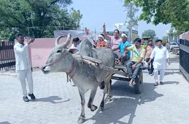 जुलाना (विजेंद्र) : नई अनाज मंडी में वीरवार को एक किसान ने अनोखे अंदाज में अपना विरोध दर्ज करवाया। गतौली गांव निवासी किसान नरेश ढांडा अपनी गेहूं की फसल ट्रैक्टर-ट्रॉली की बजाय बैलगाड़ी में भरकर मंडी पहुंचा। खास बात यह रही कि बैलगाड़ी के आगे एक व्यक्ति ढोल बजाता हुआ चल रहा था, जिससे यह दृश्य आकर्षण का केंद्र बन गया और मंडी में मौजूद लोगों की भीड़ इकट्ठा हो गई।