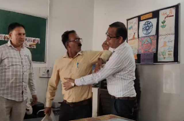स्कूल प्रिंसिपल से धक्का मुक्की करते हुए पीटी टीचर और लैब अस्टैंट
