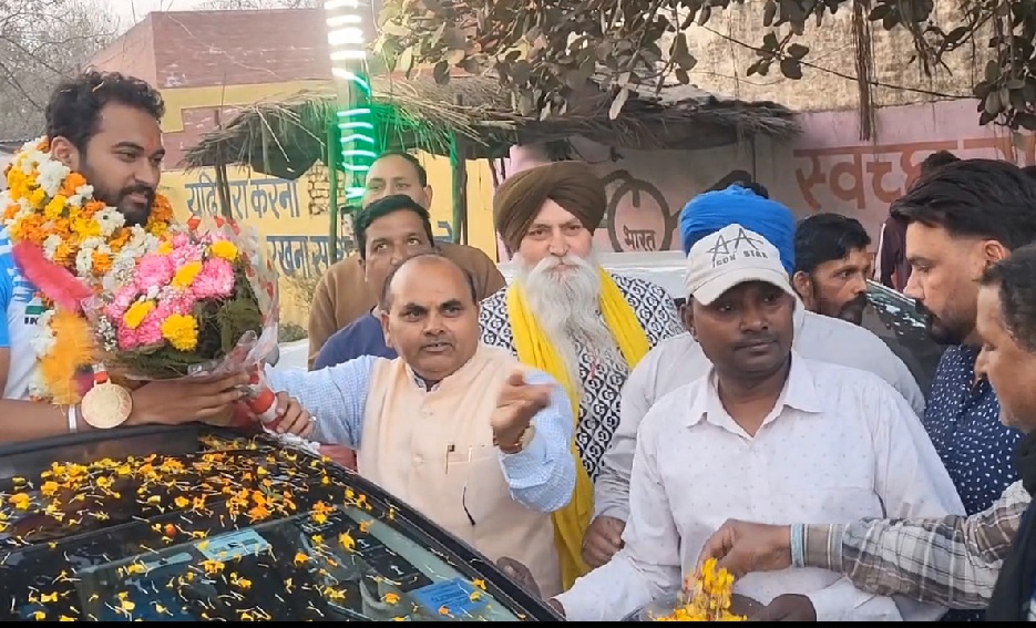 बराड़ा (अनिल शर्मा): मुलाना के गांव नहोनी के युवा खिलाड़ी आर्यन ने इंडोनेशिया में आयोजित अंतरराष्ट्रीय प्रतियोगिता में गोल्ड मैडल जीतकर देश का नाम रोशन किया है। भारत लौटने पर आर्यन का भव्य स्वागत किया गया। दिल्ली एयरपोर्ट पर आर्यन को लेने पहुंचे परिजनों व रिश्तेदारों ने ढोल बजाकर और हार पहनाकर स्वागत किया। इसके बाद श्री गुरु रविदास धर्म स्थान सिरसगढ़ पहुंचकर आर्यन ने माथा टेका, जहां संत मनदीप दास जी ने फूलमाला और सिरोपा भेंट कर आशीर्वाद दिया तथा उज्ज्वल भविष्य की कामना की।