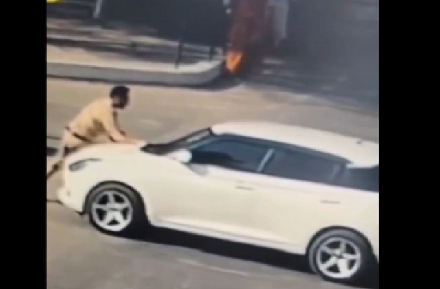 तेज रफ्तार कार ने सीधे पुलिसकर्मी को टक्कर मारी। टक्कर इतनी जोरदार थी कि पुलिसकर्मी उछलकर सीधे कार के बोनट पर जा गिरा। आरोपी चालक ने इसके बावजूद गाड़ी नहीं रोकी और पुलिसकर्मी को बोनट पर लटकाकर ही काफी दूरी तक लेकर गया। गनीमत रही कि पुलिसकर्मी ने अपनी पकड़ बनाए रखी और नीचे नहीं गिरा, अन्यथा वह टायर के नीचे आकर गंभीर रूप से घायल हो सकता था या उसकी जान भी जा सकती थी। इस हादसे में पुलिसकर्मी को हल्की चोटें आई हैं।