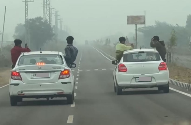जानकारी के अनुसार, 2 स्विफ्ट कारों में सवार युवक खिड़कियों से बाहर नियमों की धज्जियां उड़ाते नजर आए। युवक तेज स्पीड से चल रही कार से बाहर निकलकर रील्स बना रहे थे। यह स्टंट हाईवे पर काफी देर तक चलता रहा। इतना ही नहीं, दोनों कारों को हाइवे पर बराबर-बराबर चलाया गया, जिससे पीछे चल रहे अन्य वाहन चालकों को आगे निकलने के लिए लंबा इंतजार करना पड़ा।