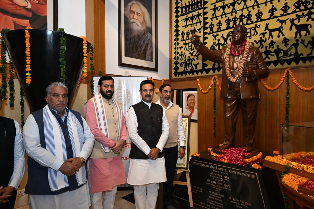 चंडीगढ़(चन्द्र शेखर धरणी): हरियाणा विधान सभा परिसर में बुधवार को संविधान दिवस मनाया गया। इस अवसर पर विधान सभा अध्यक्ष हरविन्द्र कल्याण और मुख्यमंत्री नायब सिंह सैनी समेत बड़ी संख्या में मंत्रियों और विधायकों ने यहां स्थापित डॉ. भीम राव अम्बेडकर की प्रतिमा पर पुष्पांजलि अर्पित की और संविधान की प्रति प्रतिबद्धता व्यक्त की।