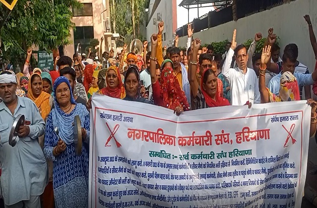 संविदा कर्मचारियों ने रोहतक सांसद के कार्यालय पर ताली-थाली बजाकर किया प्रदर्शन
