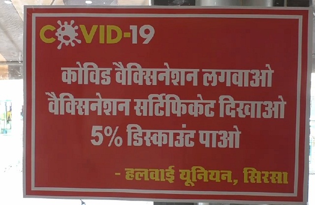 सिरसा (सतनाम सिंह): अगर अपने कोरोना वैक्सीन लगवा ली है और आप सिरसा में किसी मिठाई की दुकान पर मिठाई खरीदने जा रहे हैं तो आप अपना वैक्सीन सेर्टिफिकेट दिखाएं। ऐसा करने से आपको मिठाई पर डिस्काउंट मिलेगा। ऐसा हम नहीं बल्कि मिठाई की दुकानों पर लगे बोर्ड कह रहे हैं। दरअसल, यह फैसला हलवाई यूनियन एसोसिएशन ने लिया है।