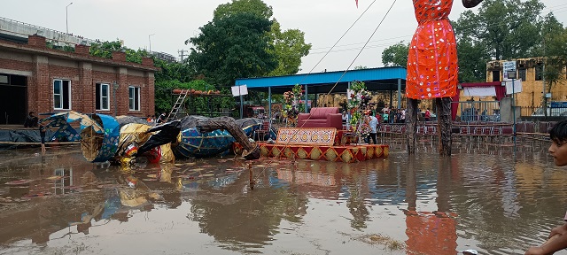गुड़गांव, (ब्यूरो): तेज बरसात ने विजयदशमी का उत्सव पटौदी-जाटोली मंडी में पूरी तरह से फीका कर दिया। विभिन्न रामलीला ग्राउंड में बरसात का भारी मात्रा में पानी भर गया। वहीं पानी ज्यादा होने की वजह से रावण का पुतला जलने से पहले ही जमीन पर गिर गया और यहां हुए जलभराव में डूब गया।बरसात के कारण जलभराव होने के कारण रामलीला को रद्द करना पड़ गया। बताया जाता है कि एकाएक आई बरसात के बाद रामलीला में लगे हुए ज्यादातर इलेक्ट्रॉनिक सामान को भारी नुकसान पहुंचा है,। वहीं, अब शेष रामलीला का मंचन शुक्रवार को करने का फैसला लिया गया है।