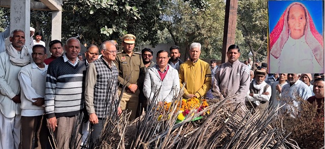 गुड़गांव, (ब्यूरो): स्वतंत्रता सेनानी स्वर्गीय जयमल सिंह की धर्मपत्नी गिन्दौड़ी देवी का शनिवार को 105 वर्ष की आयु में निधन हो गया। उनका अन्तिम संस्कार पैतृक गांव सिधरावली में पूरे राजकीय सम्मान के साथ किया गया। जिसमें जिला प्रशासन गुरुग्राम की तरफ से नायब तहसीलदार गजे सिंह ने पुष्प चक्र चढ़ाकर श्रद्धांजलि दी तथा हरियाणा सरकार द्वारा अन्तिम संस्कार राशि 5100 रूपये मौके पर ही उनके पुत्र रामकिशन लाल को दी।