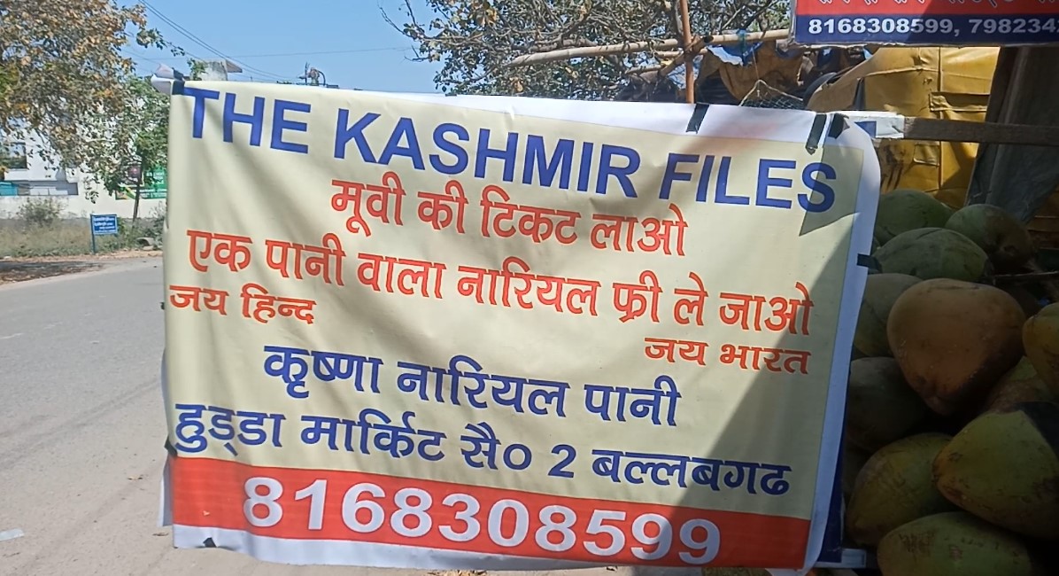 फरीदाबाद(अनिल राठी): द कश्मीर फाइल मूवी देखने के बाद एक नारियल बेचने वाले युवक के मन में अनोखा ख्याल आया। उस युवक ने अपनी दुकान के बाहर बोर्ड लगा दिया कि द कश्मीर फाइल्स के टिकट लाओ और फ्री में नारियल पी के जाओ। फरीदाबाद के सेक्टर 2 हुड्डा मार्केट के समीप एक युवक अपने परिवार का पालन पोषण करने के लिए नारियल पानी बेचता है। यह युवक मूल रूप से सोहना के पास एक गांव का रहने वाला है और 25 तारीख को है द कश्मीर फाइल फिल्म देख कर के जब निकला तो इसके मन में एक अलग ही ख्याल आया कि लोगों को यह फिल्म ज्यादा से ज्यादा देखनी चाहिए।