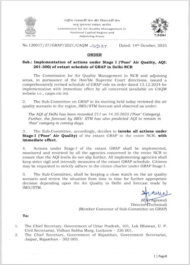 गुड़गांव, (ब्यूरो): मौसम में ठंडक आते ही दिल्ली-एनसीआर में प्रदूषण का स्तर बढ़ने लगा है। दिल्ली में प्रदूषण का स्तर खराब होते ही वायु गुणवत्ता प्रबंधन आयोग की तरफ से पाबंदियों लगानी शुरू कर दी गई है। दिल्ली में आज प्रदूषण का स्तर 211 एक्यूआई पहुंचने के बाद आयोग ने ग्रेडेड रेस्पांस एक्शन प्लान की पहली स्टेज को लागू कर दिया है। यह GRAP-1 के आदेश दिल्ली एनसीआर में लागू करते हुए कई प्रकार की पाबंदियां लागू कर दी गई हैं। इस बाबत जिला उपायुक्त को GRAP-1 नियमों की पालना कराने के आदेश भी दिए गए हैं। मौसम विभाग की मानें तो आने वाले दिनों में वायु गुणवत्ता और अधिक खराब हो जाएगी जिसके बाद पाबंदियां और अधिक बढ़ जाएंगी।