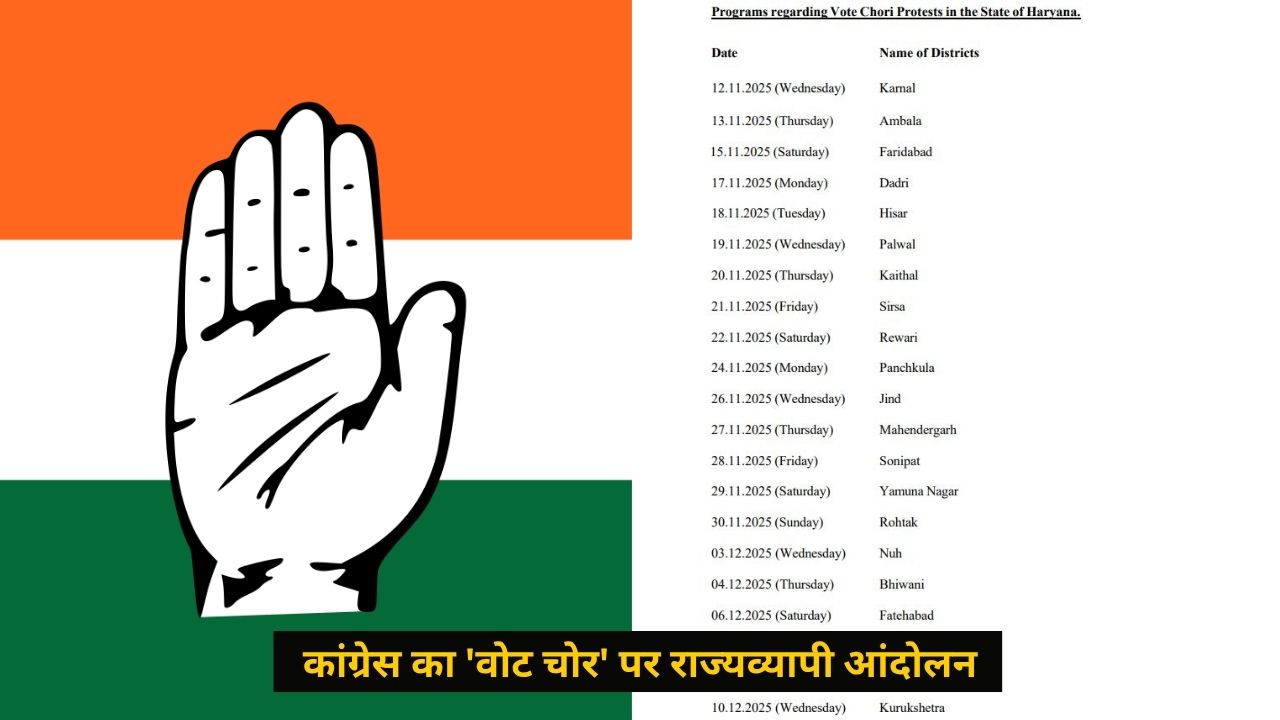 बता दें राज्यव्यापी आंदोलन की शुरुआत 12 नवंबर को करनाल से होगा। पहला प्रदर्शन सुबह 10 बजे सेक्टर-12 पेट्रोल पंप (पाठक हॉस्पिटल के पास) स्थित पार्किंग स्थल में होगा। कार्यक्रम में प्रदेश कांग्रेस अध्यक्ष राव नरेंद्र सिंह मुख्य अतिथि के रूप में और कांग्रेस कार्य समिति के सदस्य एवं सांसद दीपेंद्र सिंह हुड्डा भी शामिल रहेंगे। कांग्रेस ने तय किया है कि हर जिले में वोट चोरी को लेकर रोष प्रदर्शन होंगे और राष्ट्रपति को संबोधित ज्ञापन स्थानीय उपायुक्त के माध्यम से सौंपा जाएगा।
