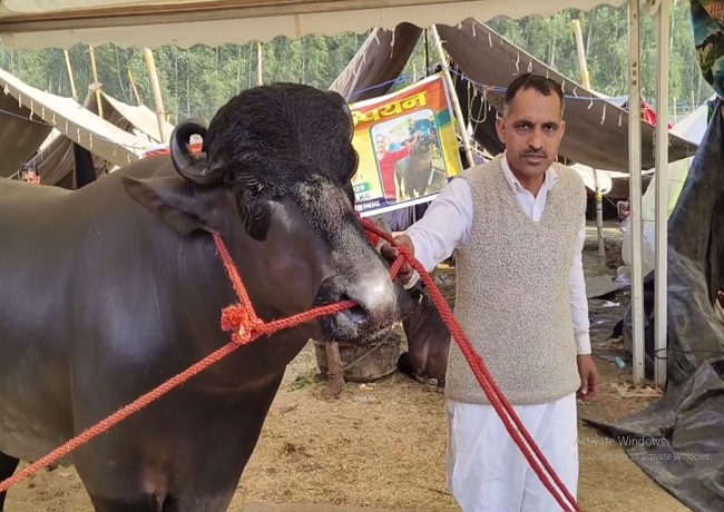 पशुपालक विकास भांभू ने बताया कि उनके झोटे कुबेर की उम्र करीब पौने 4 साल है। यह पूरी तरह शुद्ध मुर्रा नस्ल का झोटा है। इसकी ऊंचाई साढ़े पांच फुट है। इसकी चमड़ी भी मुलायम, चिकनी और पूरी तरह से ब्लैक है। कुबेर की M-29 है, जो साढ़े 23 लीटर तक दूध देती है। इसका बाप अर्जुन और दादा खली है। जो विश्व स्तरीय चैंपियन रहे हैं।