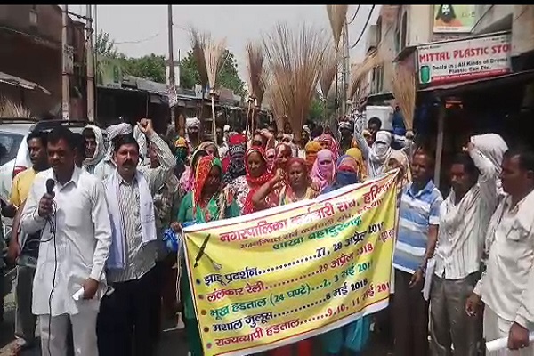 सफाई कर्मचारियों ने झाडू उठाकर किया प्रदर्शन, 2-3 मई को करेंगे भूख हड़ताल