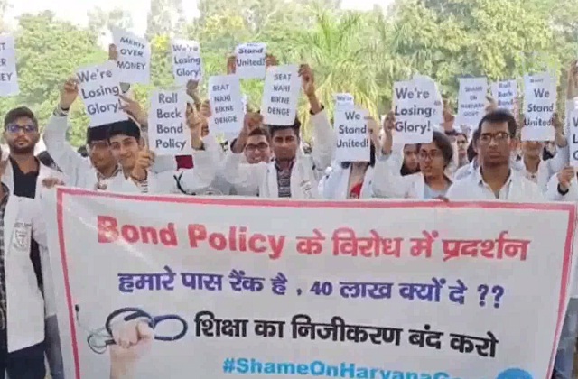 बता दें कि हरियाणा सरकार ने 2022 में चालीख लाख बॉन्ड पॉलिसी लागू की थी,जिसका लगातार विरोध बढ़ता जा रहा है। छात्रों ने कहा कि सरकार ने एमबीबीएस की सात के पढ़ाई दौरान चालिख रुपए बांड पॉलिसी लगाई है। जबकि हम टॉप रैंक हासिल कर यहां तक आए हैं तो सरकार को पैसा क्यों दें। सरकार की यह बांड पॉलिसी सही नहीं हैं। उन्होंने कहा कि पीजीआई में एक बैच में सभी कैटेगरी को मिलाकर 250 छात्र है। सरकार हमसे चालीस लाख की रुपए ले रही हैं। छात्रों ने कहा कि हमारा विरोध किसी सरकार या राजनीति दल के खिलाफ नहीं है,जबकि यह लड़ाई हमारे हक की है और हम लोग इसके लिए आगे तक लड़ते रहेंगे।