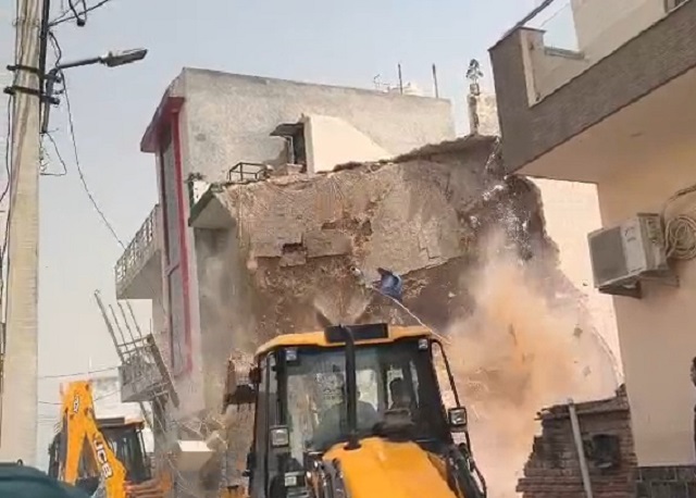 पुलिस का बुलडोजर एक्शन- कुख्यात बदमाश का मकान ध्वस्त