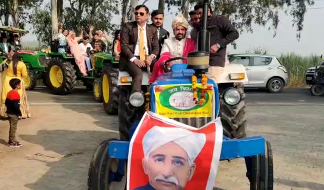 दिल्ली सीमाओं पर पिछले 25 दिन से किसान आंदोलन कर रहे हैं। किसानों के आंदोलन का समर्थन करते हुए यमुनानगर के नारायण गढ़ साढोरा से लगते गांव भुखड़ी का दूल्हा रजत नारा ट्रैक्टर पर बारात लेकर गांव हरिपुर जट्टान आया। बारात ने कई किलोमीटर का सफर ट्रैक्टर पर तय किया। इंग्लैंड में वकालत की पढ़ाई कर चुके रजत ने खुद ट्रैक्टर चलाया। रजत को ट्रैक्टर पर बैठे देख हरिपुर जट्टान के लोगों ने बारातियों के लिए भी ट्रैक्टरों का इंतजाम किया।