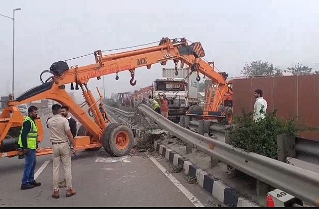 4 क्रेन की मदद से पलटा ट्रक की हाईवे से हटाया
